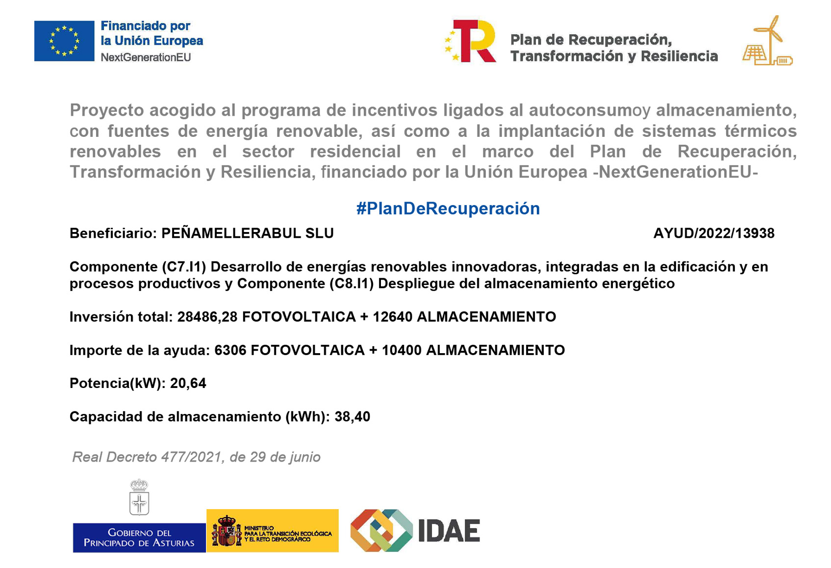 En PEÑAMELLERABULL SLU reforzamos nuestro compromiso con la sostenibilidad mediante la instalación de un sistema de generación aislada de energía eléctrica para autoconsumo con fuentes renovables y almacenamiento. Este proyecto, enmarcado en las componentes (C7.I1) Desarrollo de energías renovables innovadoras, integradas en la edificación y en procesos productivos y Componente (C8.I1) Despliegue del almacenamiento energético y acogido al Real Decreto 477/2021, ha sido financiado por la Unión Europea con cargo al Fondo NextGenerationEU dentro del Plan de Recuperación, Transformación y Resiliencia.